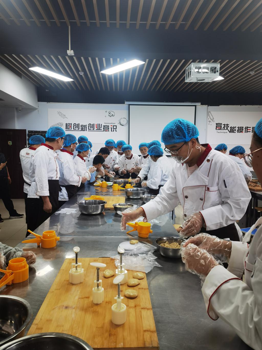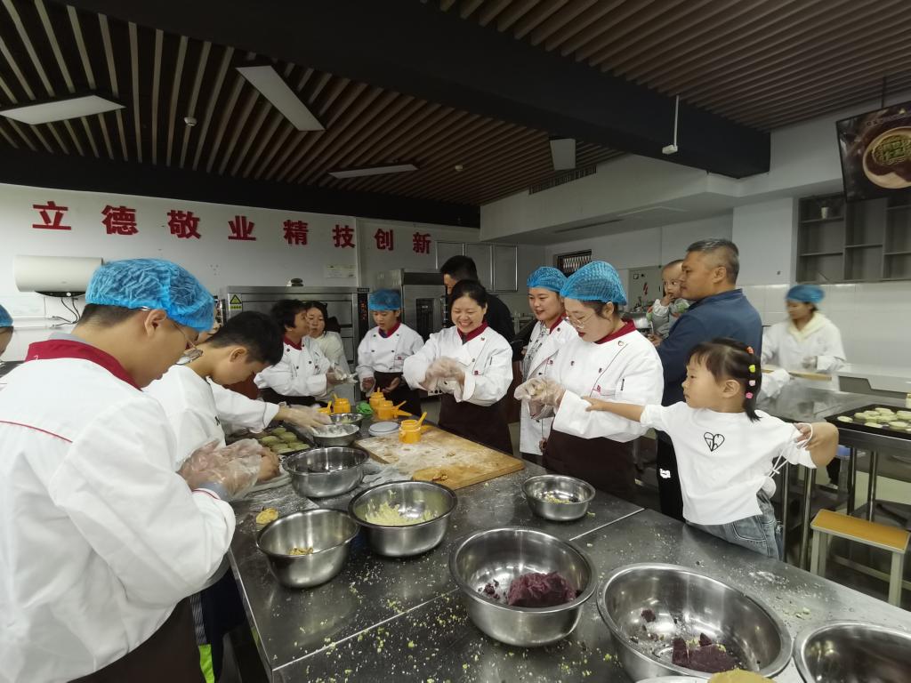 教师们整齐有序地分成小组,分工合作,一起亲手制作月饼。从搅拌面粉、和面、包馅、模具压制等每一个细节,大家都投入了满满热情和心力。活动现场笑声、欢声笑语不断。制作结束后,月饼成品一个个显露出来,各色各样的外形、丰富多样的口味,让人垂涎欲滴。