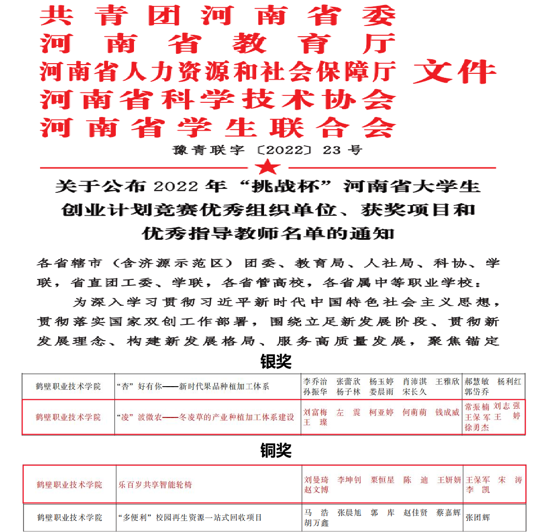 经过省级复赛、省级终审决赛两个阶段的评审,常振楠老师指导的《“凌”波微农——冬凌草的产业种植加工体系建设》荣获银奖,王保军老师指导的《乐百岁共享智能轮椅》荣获铜奖。