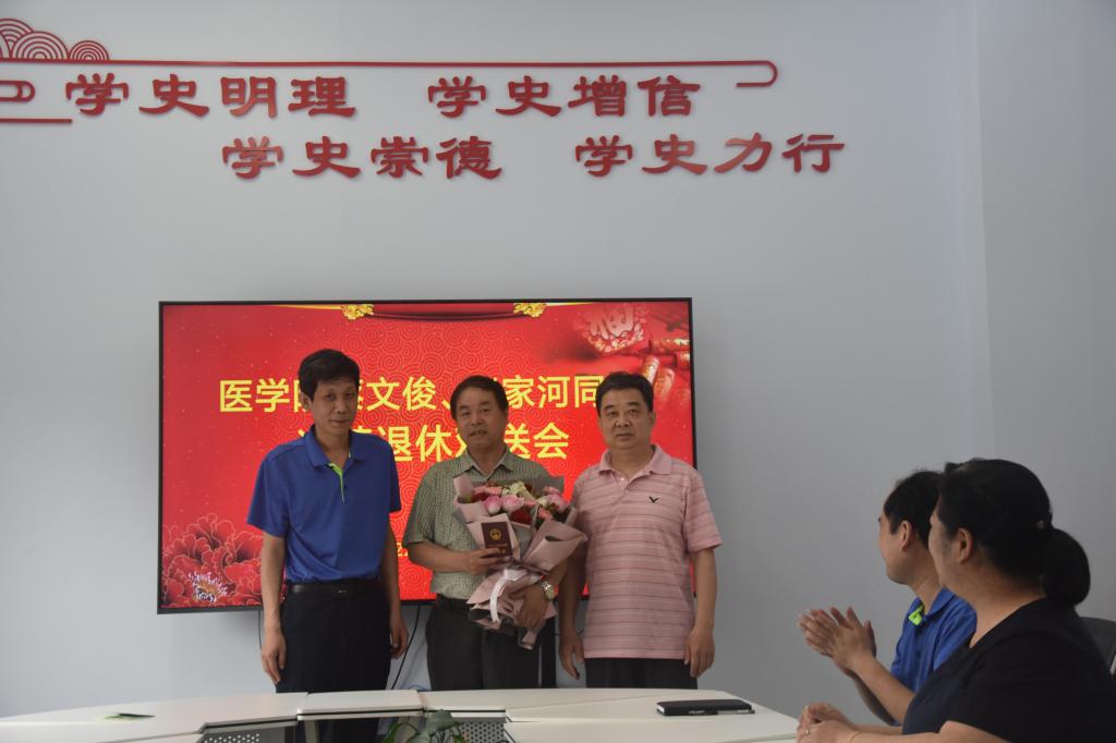 5月27日下午,太阳成集团tyc122cc在D315会议室举办退休同志欢送会,太阳成集团tyc122cc党总支书记李宏伟、经理杨尚玉及全体班子成员为退休的蔡文俊、张家河两位同志颁发退休证、赠送鲜花,忆如歌往事,话难舍情怀。