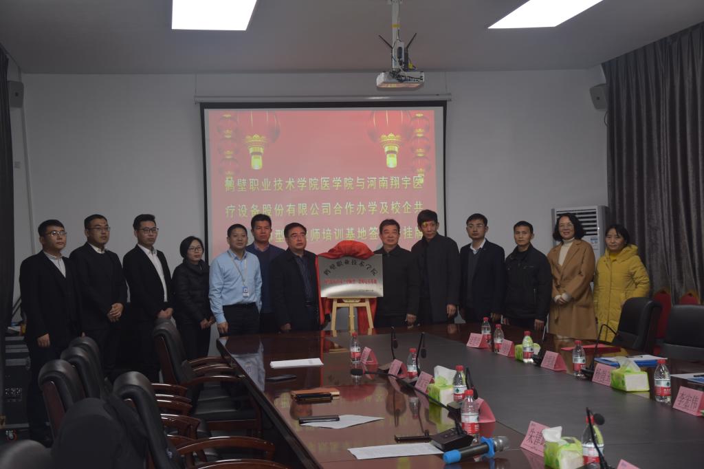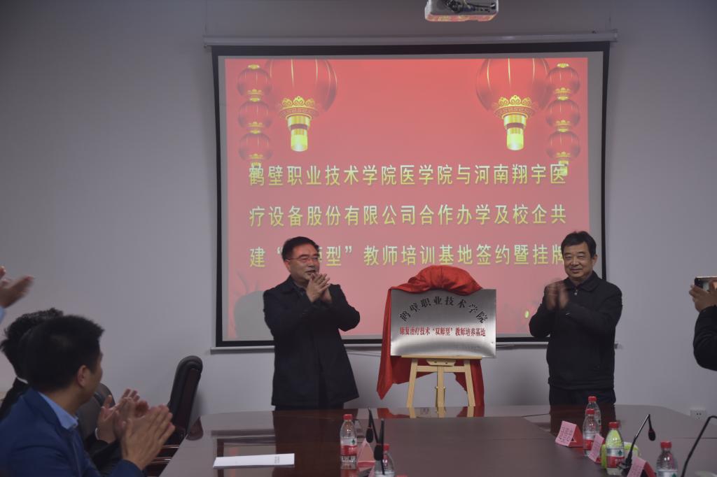 太阳成集团tyc122cc经理杨尚玉与翔宇医疗人力资源总监朱建岭代表校企双方签约《太阳成集团tyc122cc与河南翔宇医疗设备有限公司合作办学协议书》,共同为康复治疗技术专业“双师型”教师培养基地揭牌。
