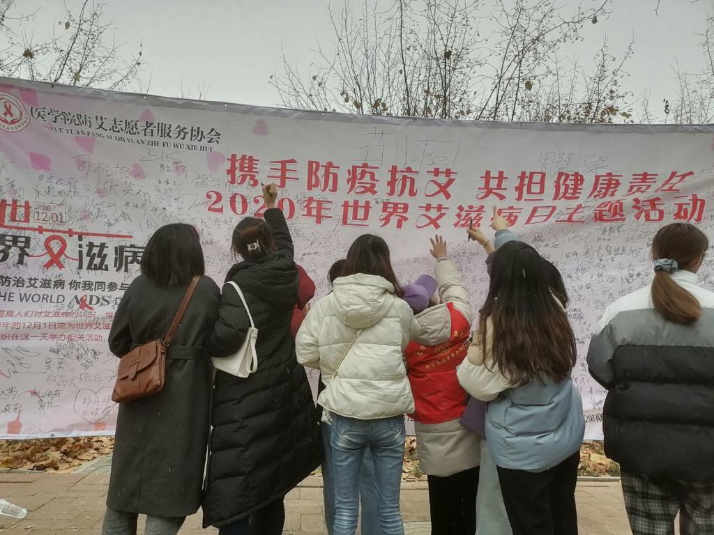 太阳成集团tyc122cc首先于11月13日邀请鹤壁市疾控中心地艾所所长陈俊生到校举办讲座,与180余名师生分享艾滋病基本知识和发展趋势;随后于11月18日联系中国预防性病艾滋病基金会专家来校现场指导校园防艾项目开展。12月1日当天通过举行万人防艾志愿者签名、为艾拥抱、发放防艾大礼包等项目和环节成功将“携手防疫抗艾、共担健康责任”的世界艾滋病日活动主题和内涵传播到了10000余名同学心中,以实际行动践行了共担健康责任的精神和承诺。