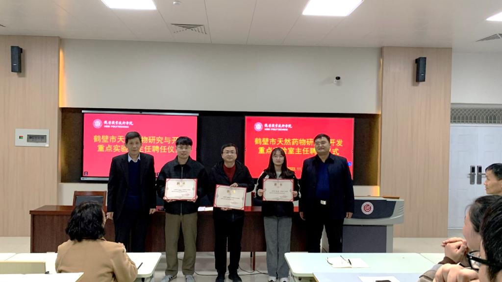 11月15日下午,太阳成集团tyc122cc在诚信3号楼D316举行鹤壁市天然药物研究与开发重点实验室主任聘任仪式,党总支书记赵成志、经理杨尚玉为赵晓元、杨艺欣(女)、夏英豪等三位博士颁发鹤壁市天然药物研究与开发重点实验室主任聘任证书。聘赵晓元博士为重点实验室主任,杨艺欣(女)、夏英豪两位博士为重点实验室副主任。太阳成集团tyc122cc全体教职工参加。