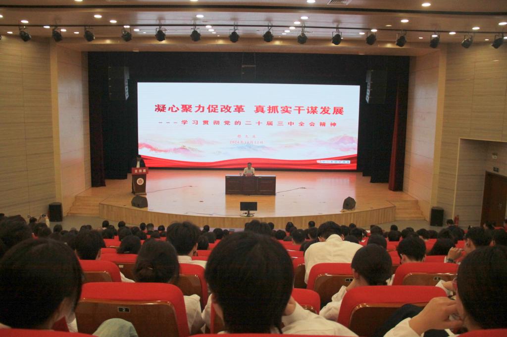 会上,蔡太生介绍了党的二十届三中全会的基本情况,从充分认识党的二十届三中全会的重大意义、深刻学习领会党的二十届三中全会精神实质、全力以赴抓好党的二十届三中全会精神贯彻落实等方面进行了系统阐述和详细解读。他指出,党的二十届三中全会围绕推进中国式现代化的宏伟目标,精心擘画了全面深化改革的战略蓝图。全会审议通过的《中共中央关于进一步全面深化改革、推进中国式现代化的决定》提出:“教育、科技、人才是中国式现代化的基础性、战略性支撑。必须深入实施科教兴国战略、人才强国战略、创新驱动发展战略,统筹推进教育科技人才体制机制一体改革,健全新型举国体制,提升国家创新体系整体效能。”为新时代推动教育高质量发展提供了重要指导和遵循。他强调,学校要深入学习贯彻党的二十届三中全会精神,全面贯彻党的教育方针,落实立德树人根本任务,扛牢为党育人、为国育才崇高使命,牢牢把握职普融通、产教融合、科教融汇,积极探索办学机制改革创新,不断提升人才培养水平,提高服务发展能力,为现代化产业体系建设、培育发展新质生产力和现代化河南建设培养更多高素质技术技能人才,为推进中国式现代化贡献职教力量。