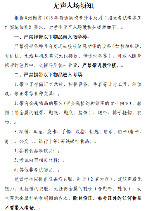 考生服装穿戴要符合“无声入场”要求。考生应提前备足考试所用文具。考生不得携带规定以外的文具进入考场。入场演练时,文具检查过后,监考老师在考生注视下,将文具放置到考生对应的座次标签旁,文具放好后,考生签字确认,文具不再带出考场。每场用毕自行收纳放入文具袋内并放置于座次标签旁。所有科目考试结束后,方可带出考场。
