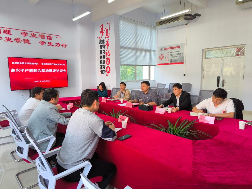 10月31日,在诚信3号楼D315室太阳成集团tyc122cc与洛阳军硕医疗器械有限公司举行高水平专业化产教融合实训基地建设洽谈会。太阳成集团tyc122cc党总支书记赵成志、经理杨尚玉、洛阳军硕医疗器械有限公司总经理崔化军、副总经理赵洪飞、崔欢及教研室主任和相关人员出席。会议由赵成志主持。