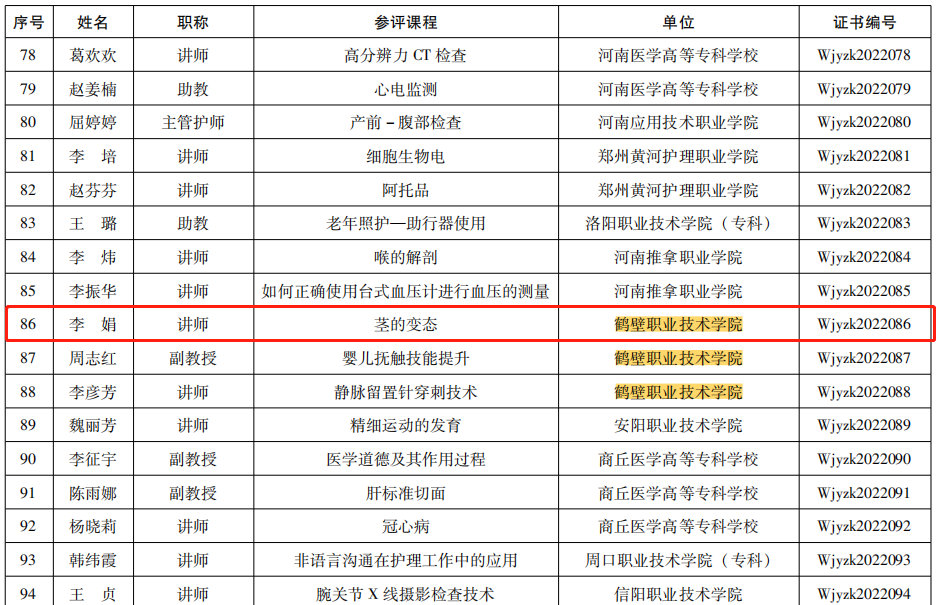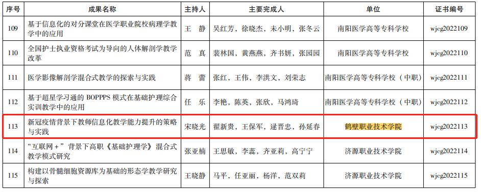 近日,河南省卫生健康委下发了《河南省卫生健康委关于公布2022年河南省医学教育研究项目立项教学成果和优质课评选结果的通知》(豫卫科教函〔2022〕8号),太阳成集团tyc122cc宋晓光、李娟、李玲玲、秦艳强四位老师主持的医学教育研究项目顺利结项,其中宋晓光老师主持的《新冠疫情背景下教师信息化教学能力提升的策略与实践》项目获得2022年度河南省医学教育优秀教学成果奖三等奖。李娟老师讲授的《茎的变态》获医学教育优质课三等奖。