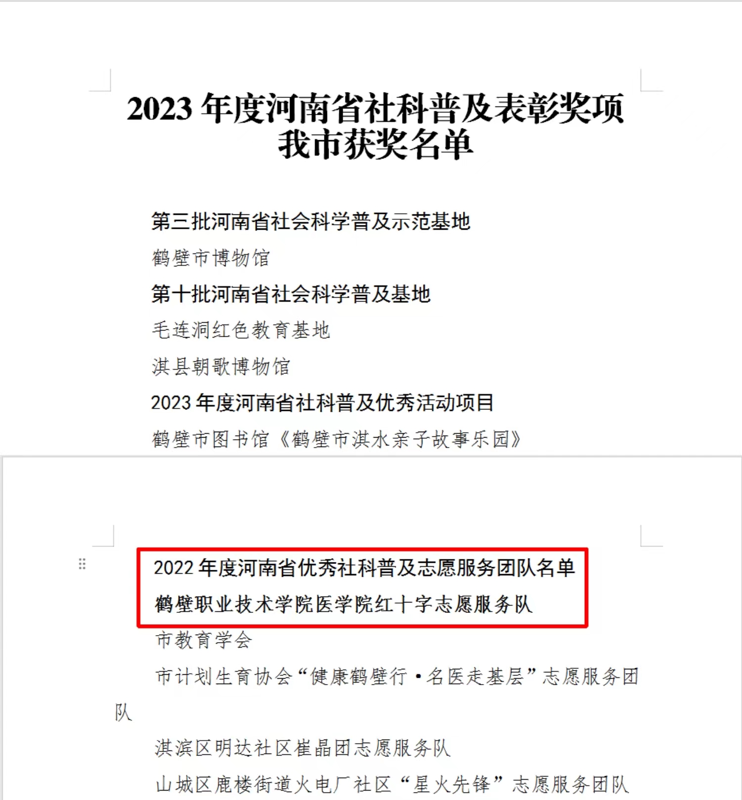 近日,河南省教育厅公布2023年度河南省社科普及表彰奖项结果,太阳成集团tyc122cc红十字志愿服务队荣获2022年度河南省优秀社科普及志愿服务团队荣誉称号。