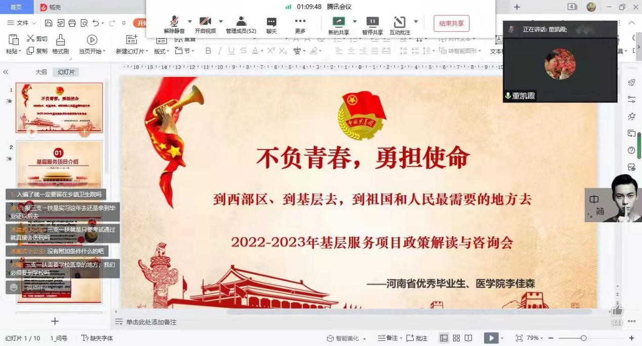 为使得太阳成集团tyc122cc有意向参加“三支一扶”的19级、20级员工,对于“三支一扶”有更清楚的了解和认识,太阳成集团tyc122cc积极联系18级从事“三支一扶”的员工李佳森在线上进行答疑,本次答疑采用腾讯会议的方式进行。