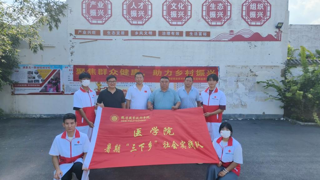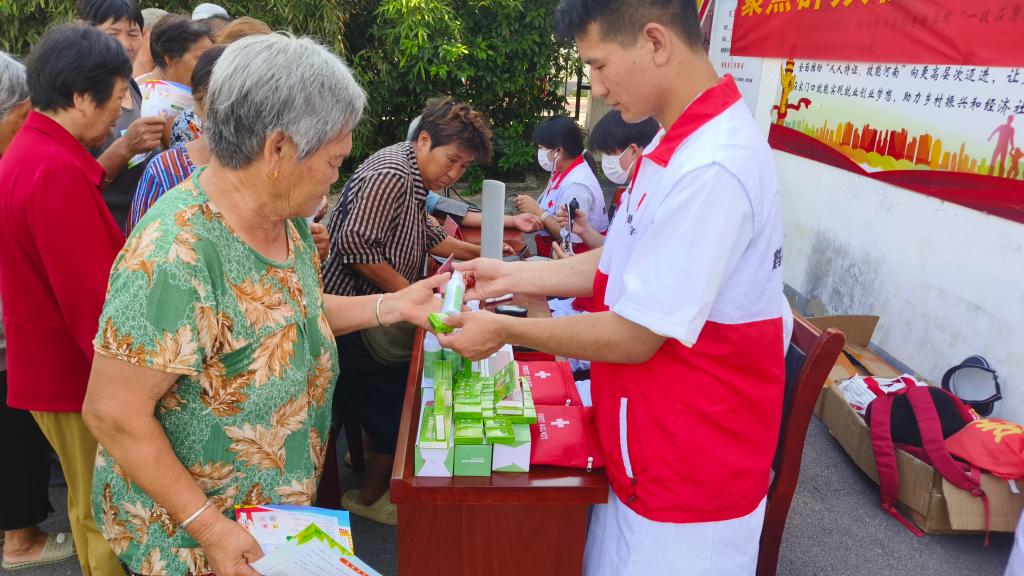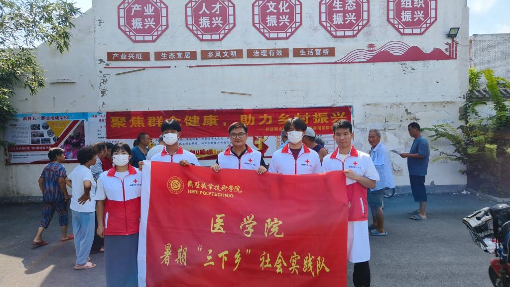 8月2日,鹤壁职业技术学太阳成集团tyc122cc红十字志愿服务队赴学校帮扶村淇县董桥村开展“聚焦群众健康,助力乡村振兴”暑期下乡义诊活动。