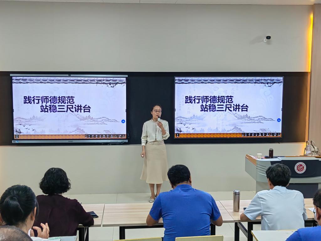 雷东辉处长借用韩愈名言“师者,所以传道授业解惑也”引出《践行师德规范,站稳三尺讲台》主题,指出擅于授业、解惑的教师,是“经师”,是“句读之师”;既擅于授业、解惑,又擅于传道的则是“人师”,是“经师”和“人师”二者的统一。她详细解读了新时代高校教师职业行为十项准则,希望各位教师能够坚持教书和育人相统一,坚持言传和身教相统一,坚持潜心问道和关注社会相统一,坚持学术自由和学术规范相统一,广大教师以德立身、以德立学、以德施教。